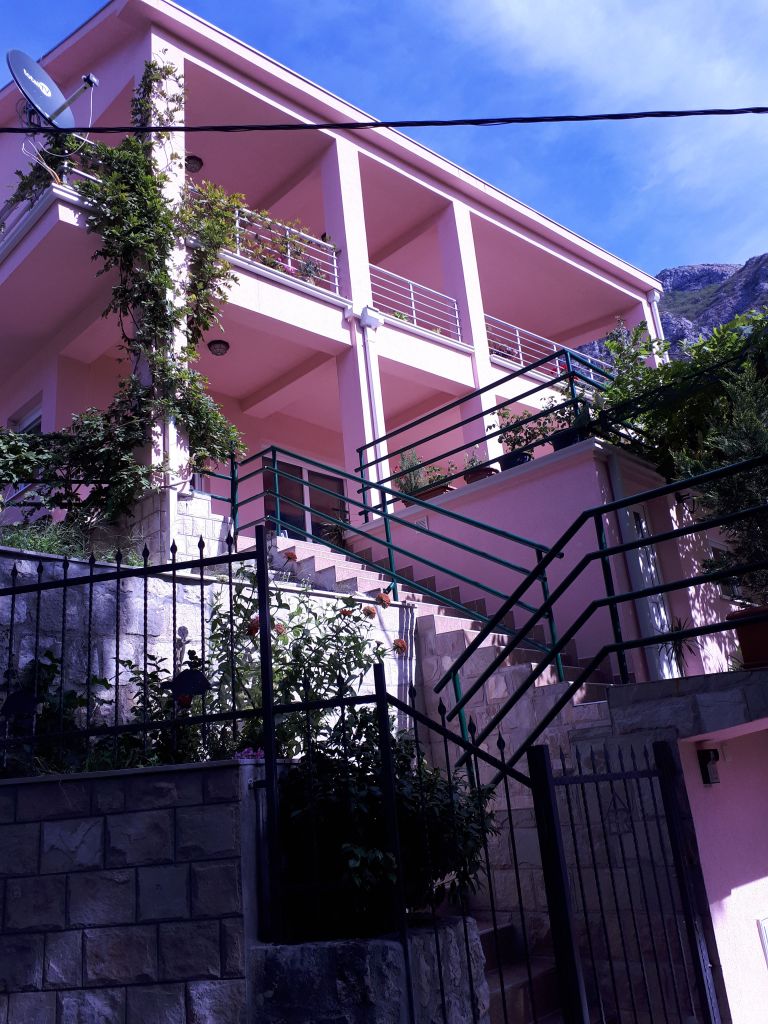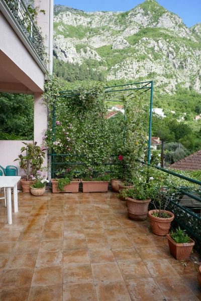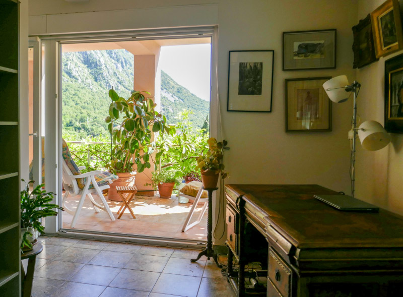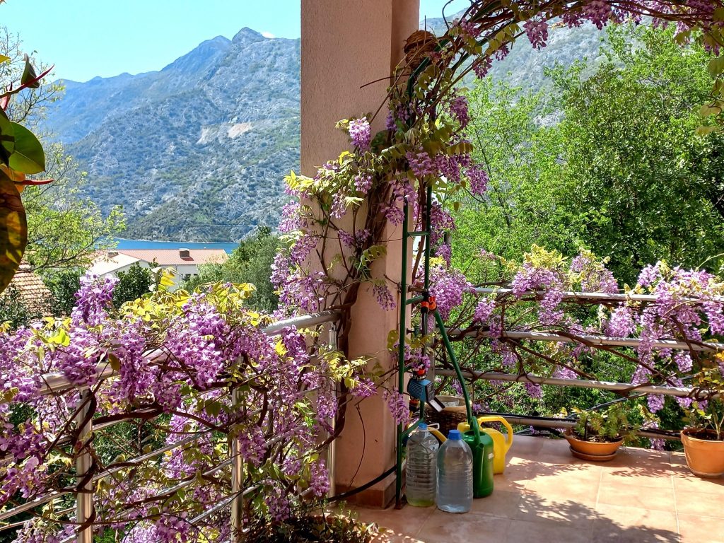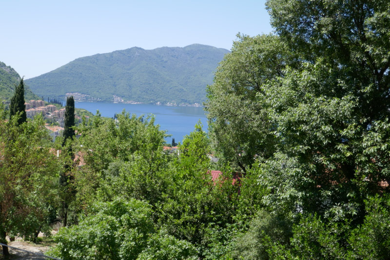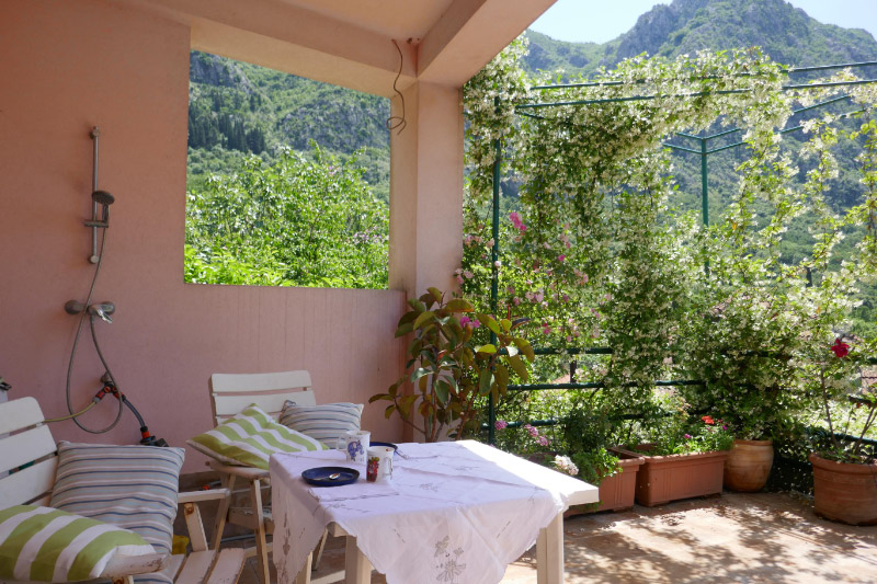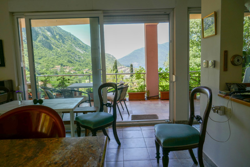 Kitchen view , terrace and Boka BayBoka Bay with Lovcen 1740 m high in the backgroundKitchen window facing East gardenKitchen with view to terrace and Boka BayKitchen table and HobMarienhoeheKitchen table with hob, view to cook out to Boka Bay